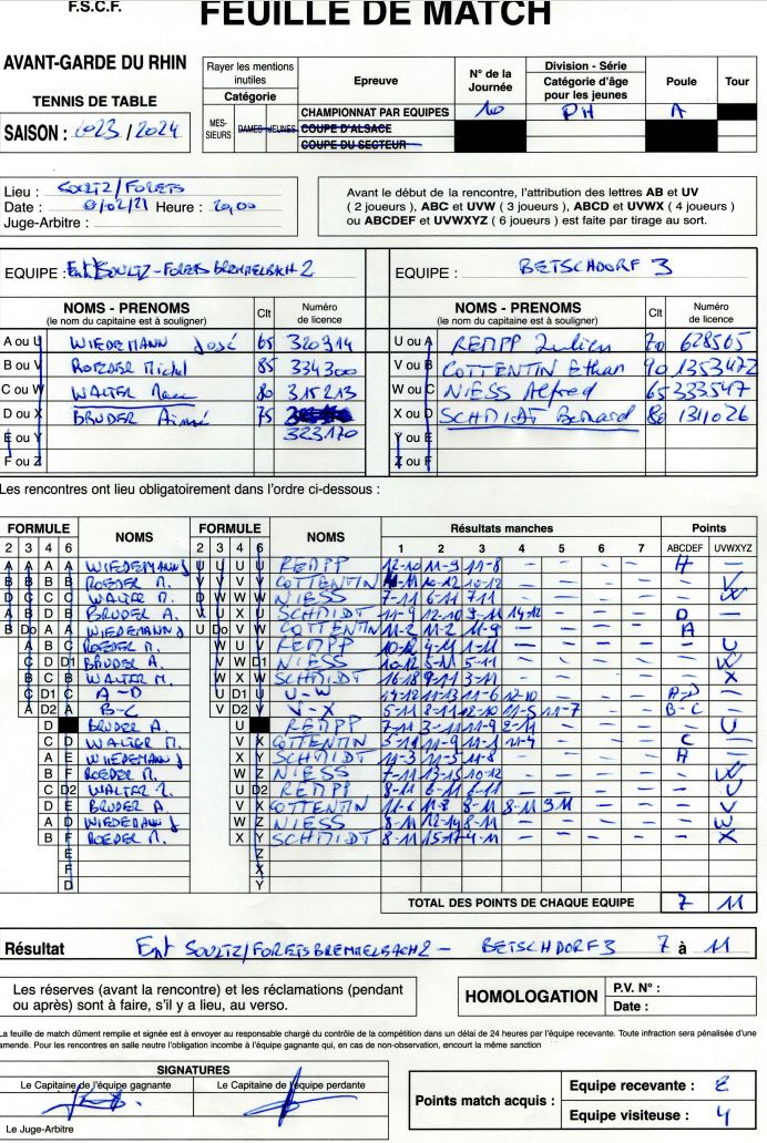 - Soultz 2 – Betschdorf 3 : 7 – 11 => Feuille de match