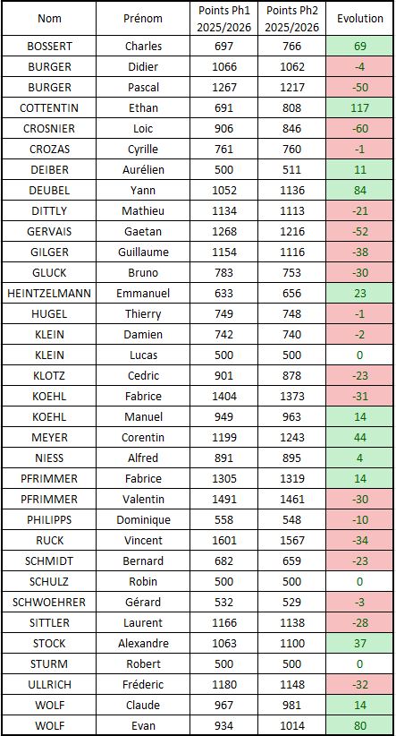La situation est toute différente pour les réserves qui se sont lourdement inclinées sur les tables de Brumath 1. La défaite 1-13 conjuguée à la victoire de Sarre-Union fait terminer le groupe à la dernière place. L’équipe repartira en GE4 pour la phase 2.