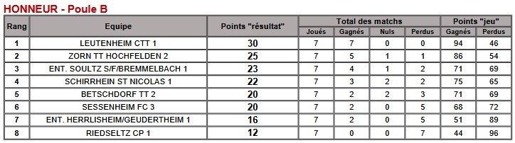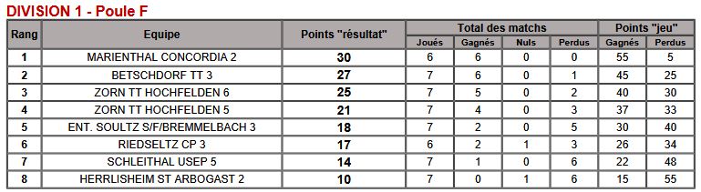 La 1 a alterné le bon (une nouvelle perf de Mathieu, la perf habituelle de Yann) et le moins bon (un certain nombre de contre-perfs) sur les tables de Marienthal 1. La défaite 14-6 fait rester le groupe derrière son adversaire du jour en moitié basse du tableau, mais à bonne portée des relégables.