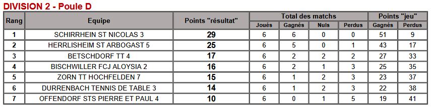 L’équipe 4 a tremblé jusqu’au bout contre un combatif Bischwiller 2. Il lui a fallu attendre le gain du double à la belle pour fêter un partage des points qui lui vaut de terminer la phase sur la plus petite marche du podium de la poule : encourageant et motivant pour la phase retour.