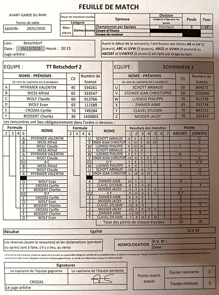 Sous la houlette de son capitaine Robert Sturm, en net regain de confiance et auteur, une première lors de cette phase, de 2 points précieux, l’équipe 7 a survolé la rencontre face à Durrenbach 4 : la victoire 7-3 fait remonter le groupe en milieu de classement.
