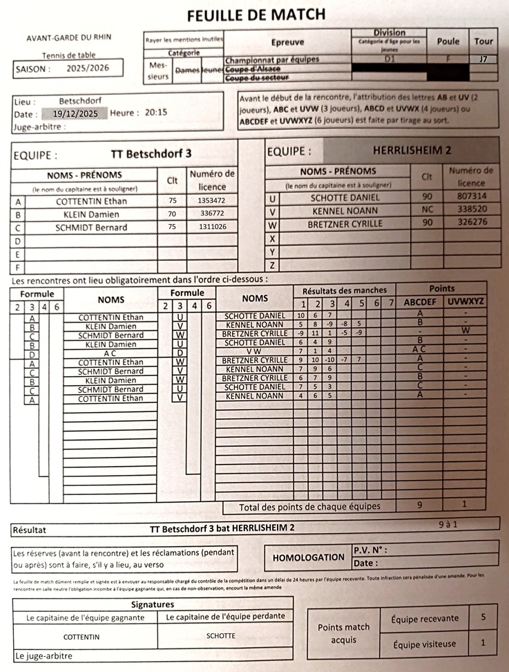 La 4 étant exempte cette journée, il est revenu à la 3 de conclure cette journée avec une victoire. Chose faite et bien faite : bien que renforcée, l’hôte du soir, Zorn TT 5, n’a eu droit qu’à des miettes. Le capitaine Ethan Cottentin y est allé d’une nouvelle perf sur le N°1 adverse pour ouvrir la voie vers une large victoire 8-2 avec bonus. Ce succès lui permet de dépasser son adversaire du soir au classement et de prendre place sur le podium de sa poule.