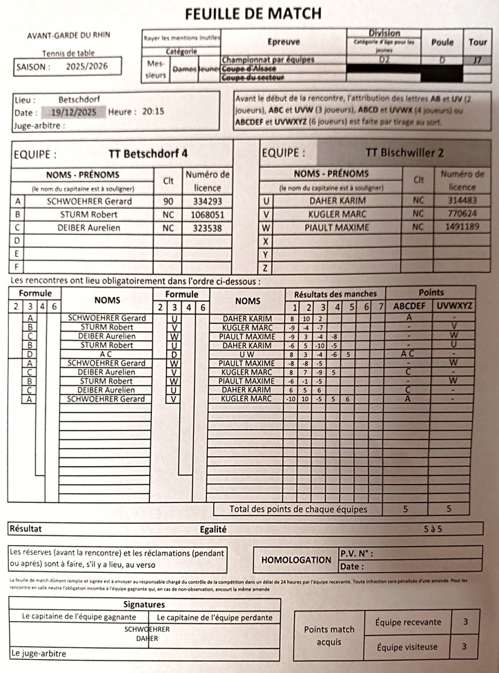 Fin novembre, nous voilà déjà dans la 2ème partie de la phase aller du championnat FFTT avec la 5ème journée.