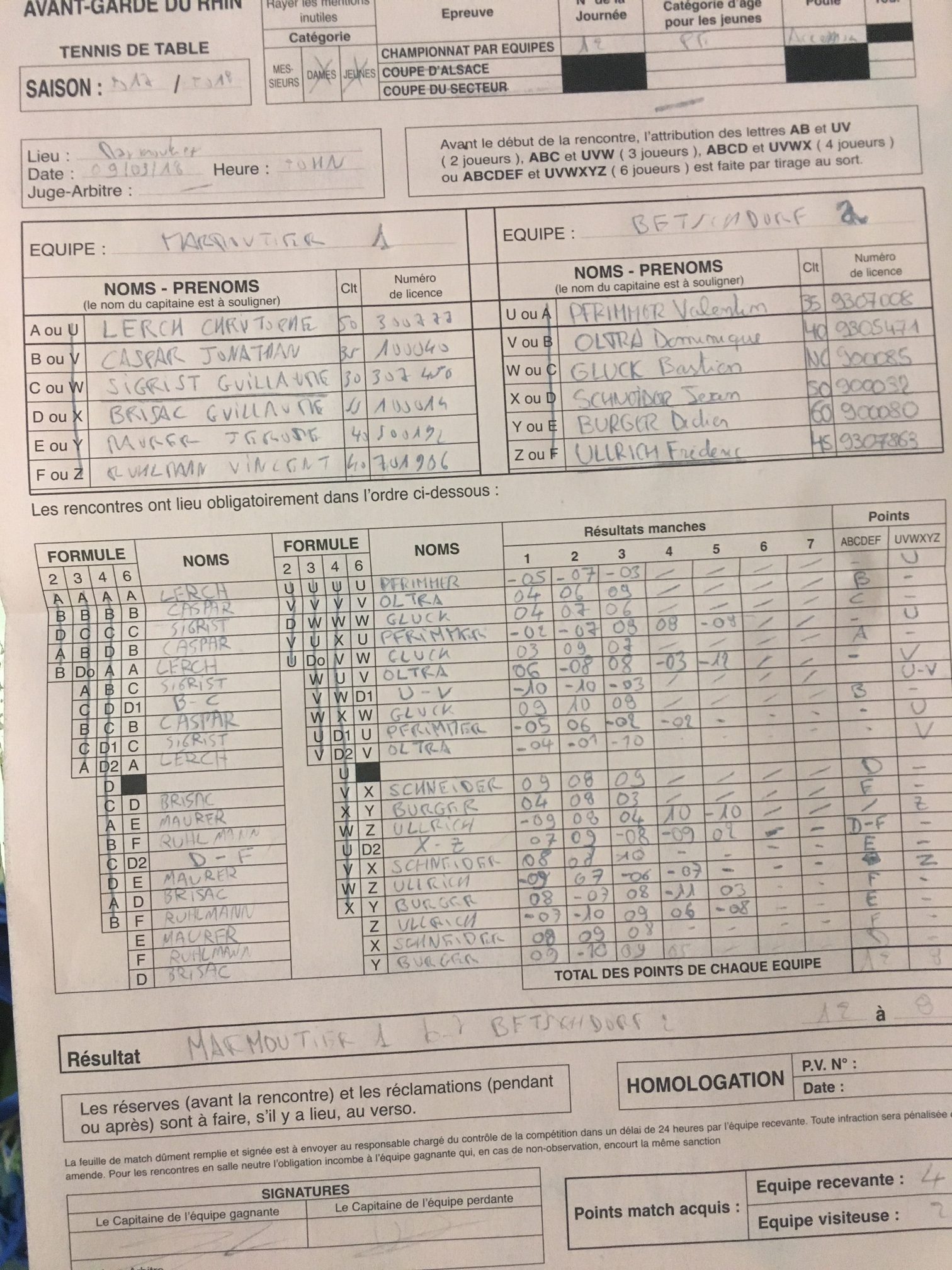 Dorlisheim 1 – TTB 2 8 – 6 (Laurent 2V, Fab 2V, Guillaume 1V, Gaetan 1V)